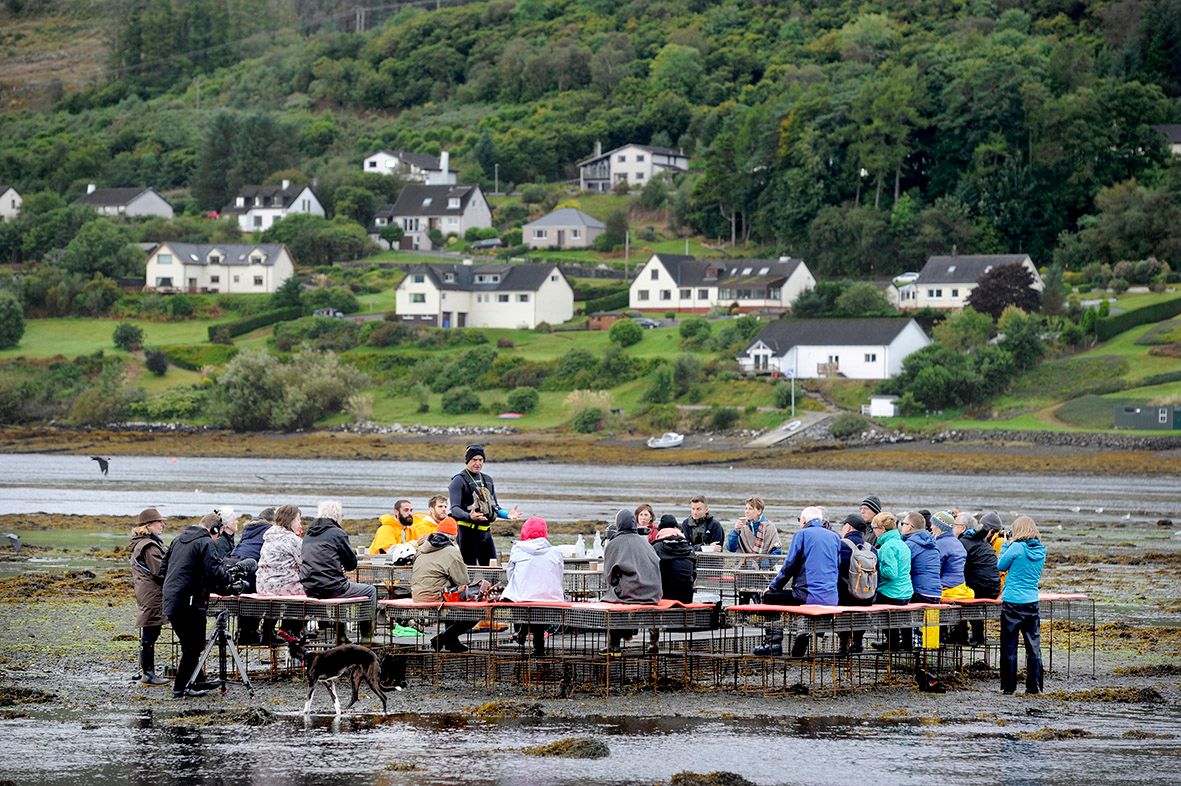 As an alternative, CLIMAVORE creates intertidal systems to produce food while also cultivating diverse marine habitats. By filtering seawater as they breathe, bivalves break down and reabsorb waterborne toxins. One mussel is able to filter up to 25 litres of water a day and a single oyster up to 120 litres. Seaweeds, meanwhile, are like trees, oxygenating their surroundings. All of these ingredients provide easy-access protein without the need for irrigation, fertilisers, medication, or colouring. Divesting from salmon farming requires shifting to intertidal foodways that nourish both people and the coast.